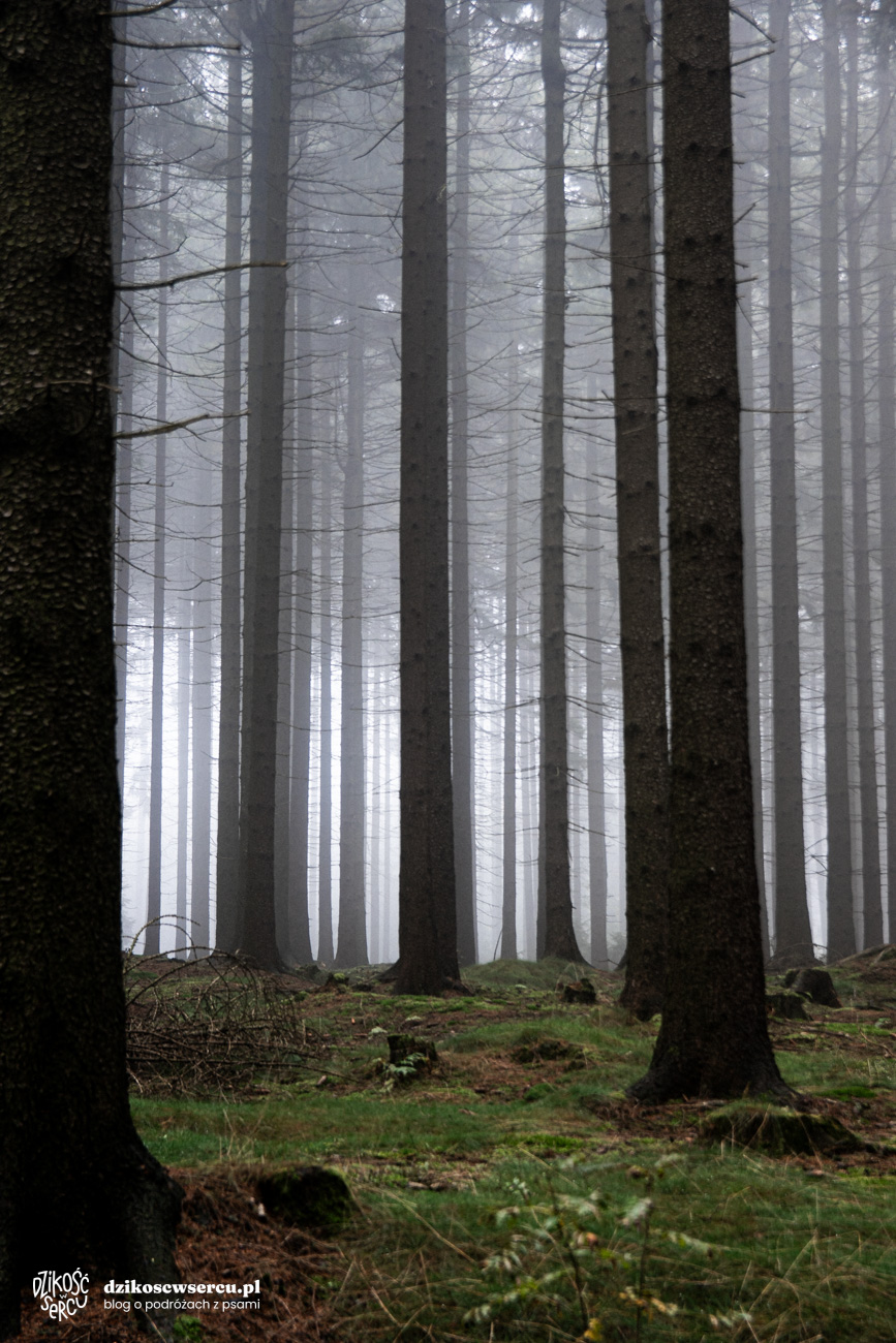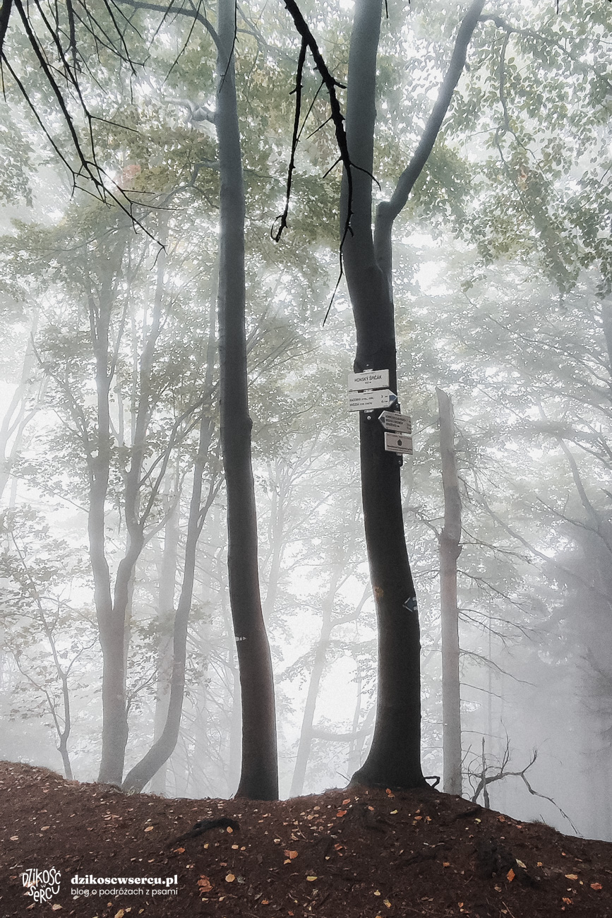 Tak czy siak, z parkingu przechodzimy na drugą stronę bardzo ruchliwej, tranzytowej drogi i od razu znajdujemy się na niebieskim szlaku. Stąd na Honský Špičák jest bardzo blisko, a szlak łagodnie unosi się ku górze. Idziemy w mgle, którą kolokwialnie mogłabym nazwać mgłą totalną. Las jest absolutnie magiczny. Nie pada, nie świeci słońce. Pogoda jest dosłownie mglista. Na szczyt docieramy po kilkunastu minutach, a z podejściem radzą sobie wszystkie psy. Nawet 6-miesięczny szczeniak i 14-letnia seniorka. Honský Špičák (652 m) nie odkrywa przed nami żadnych widoków, chociaż gdyby nie mgła, to chyba powinny jakieś być.