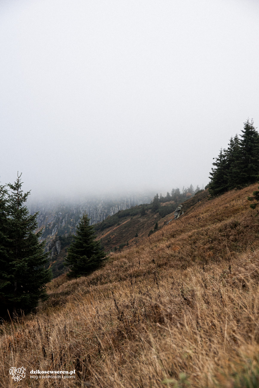 Wędrówkę rozpoczynamy w dobrych humorach, pomimo ponurej, jesiennej aury. Początkowo idziemy żółtym szlakiem, który prowadzi nas trawersem zbocza. Idziemy dziarko w mocnym tempie, bo wiemy, że to jedyne takie podejście na całej trasie. Jest długie i monotonne, ale jedyne! Im wyżej podchodzimy, tym gęstsza mgła nas otacza. Bez przeciwdeszczówki ani rusz, bo pada coraz silniejsza mżawka.